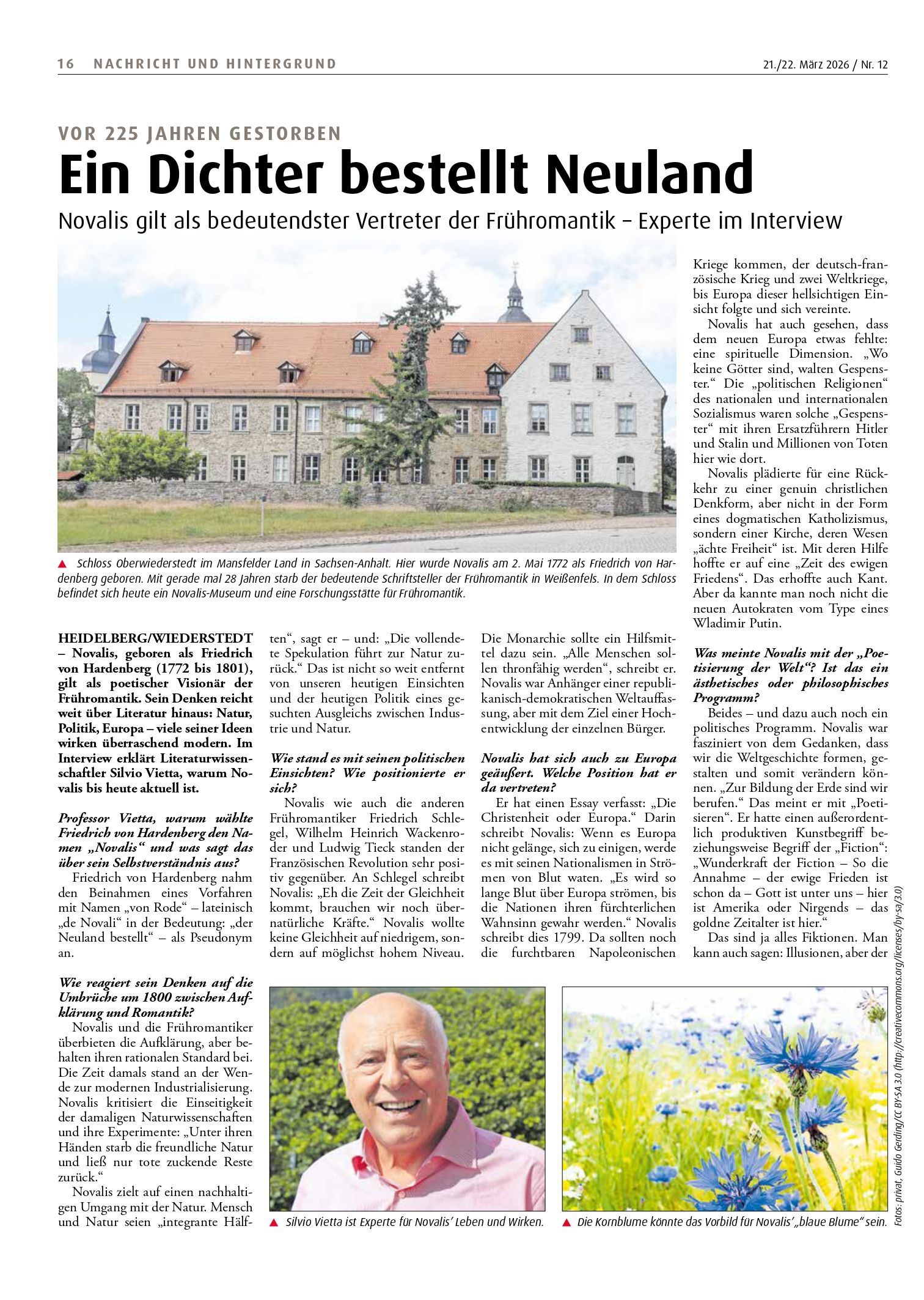 Silvio Vietta, Mitglied der Internationalen Novalis-Gesellschaft, Novalisforscher und Literaturwissenschaftler, im Interview mit der "Katholischen Sonntagszeitung für Deutschland" anlässlich des 225. Todestages von Novalis